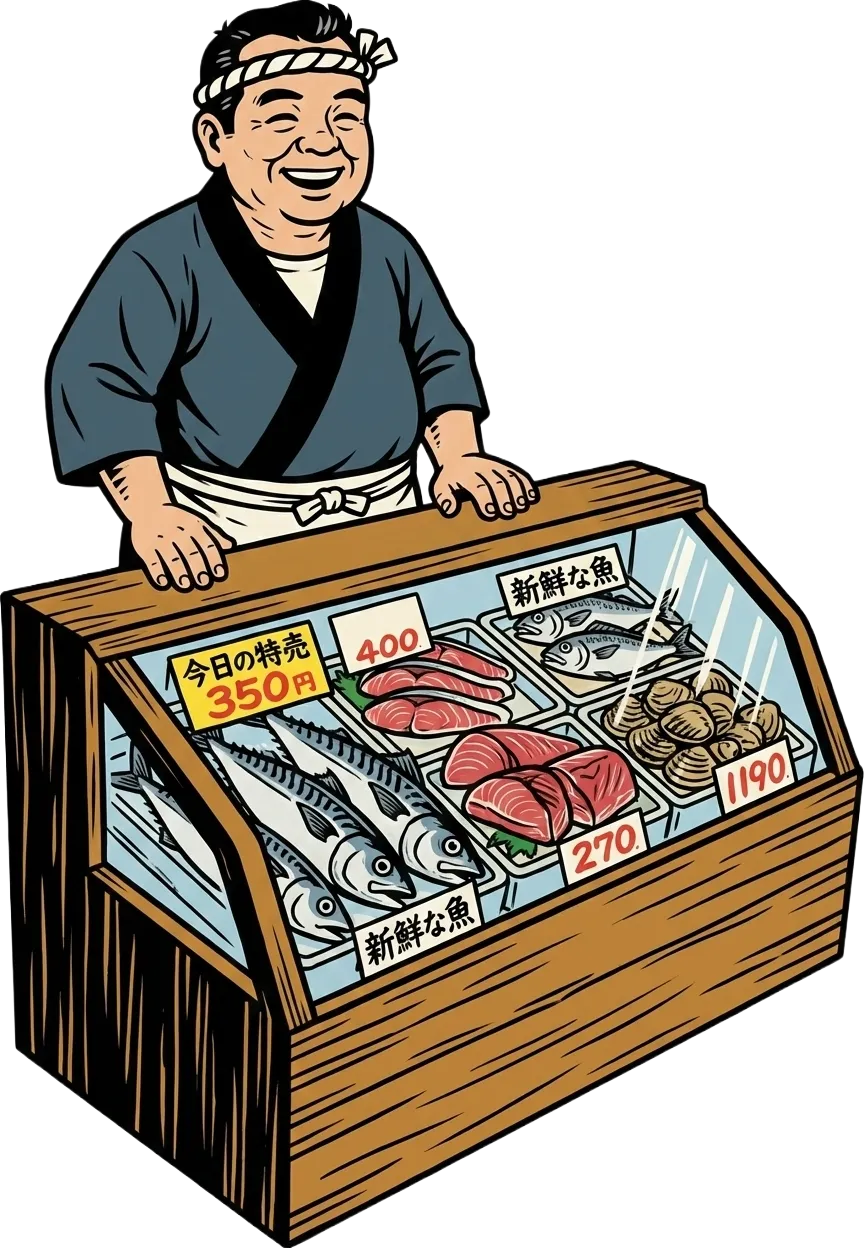 水産仲卸売場棟4階 魚河岸横丁内「山茂」「吉岡屋」「嘉ノ屋」「全国特産漬物」「高島屋海苔店」「つきじ丸高」「伊藤ウロコ」「魚がし横丁事務所」